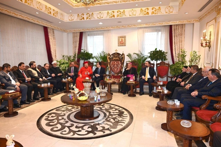On Sunday evening, April 12, 2026, a delegation from the Kurdistan Regional Government, consisting of Dr. Pshtiwan Sadiq, Minister of Endowments; Ano Jawhar, Minister of Transport; and Omed Khoshnaw, Governor of Erbil, visited "Metropolitan Nicodemus Daoud Matti Sharaf," Archbishop of the Syriac Orthodox Archdiocese of Kurdistan and Mosul, at the Ankawa Judicial Center, to convey holiday greetings.